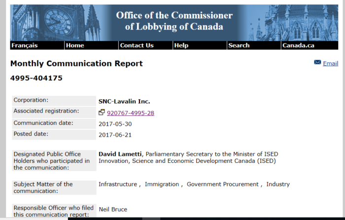(then Parliamentary Secretary to Minister for ISED, David Lametti, met with SNC Lavalin President Neil Bruce)
