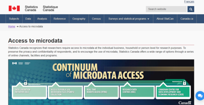 Statistics Canada offers Public Use Microdata Files (PUMFs) to institutions and individuals. They are non-aggregated data which are carefully modified and then reviewed to ensure that no individual or business is directly or indirectly identified. These can be accessed directly through the Data Liberation Initiative (DLI) or the PUMF Collection for a subscription fee. Individual files can also be requested at no cost.