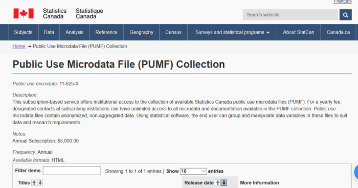 Remember, StatsCan allows people to order individual files for free. It you want a full 1-year subscription, it costs a mere $5,000. If you are interested in real data mining, it’s pocket change.