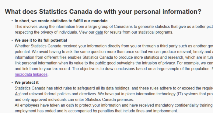 StatsCan openly admits that it will combine data from various sources and combine it. So this “anonymizing” is only done AFTER various things are combined, if it even done at all.