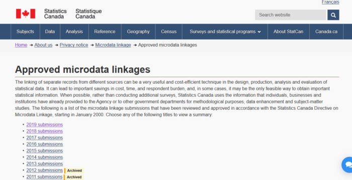 The linking of separate records from different sources can be a very useful and cost-efficient technique in the design, production, analysis and evaluation of statistical data. It can lead to important savings in cost, time, and respondent burden, and, in some cases, it may be the only feasible way to obtain important statistical information. When possible, rather than conducting additional surveys, Statistics Canada uses the information that individuals, businesses and institutions have already provided to the Agency or to other government departments for methodological purposes, data enhancement and subject-matter studies. The following is a list of the microdata linkage submissions that have been reviewed and approved in accordance with the Statistics Canada Directive on Microdata Linkage, starting in January 2000. Choose any of the following titles to view a summary:
