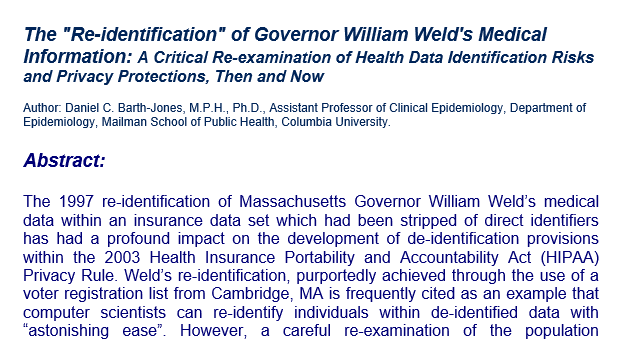 This is an old case, but a good one. Former Massachusetts Governor William Weld was able to have his medical history re-identified from anonymized medical information. How so? State voter rolls provided birth date and zip code information. Being a public figure, people knew quite a bit about him. Even with redacted records, it was possible to piece it together.